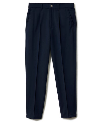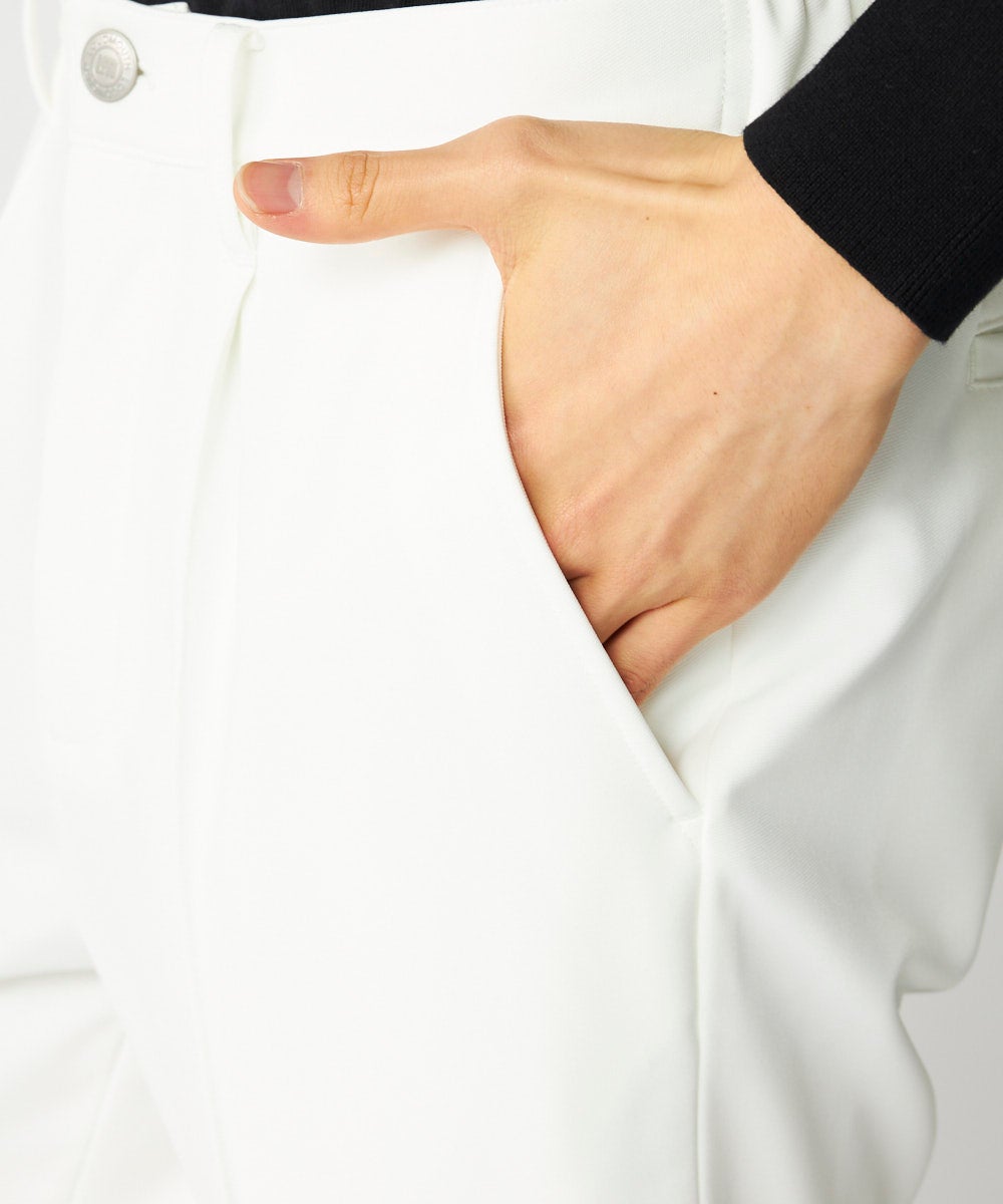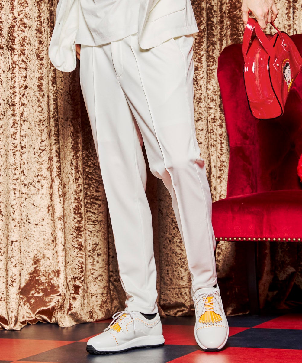 最大の特徴は、「上品な佇まい」と「ストレスのない可動域」を追求した、ややゆとりのあるこだわりのシルエット。脚長効果を発揮する計算されたテーパードラインに、ステッチで固定された「ピンタック」を施すことで、激しいスイングや長時間の着用でもシャープなセンターラインが消えることはありません。