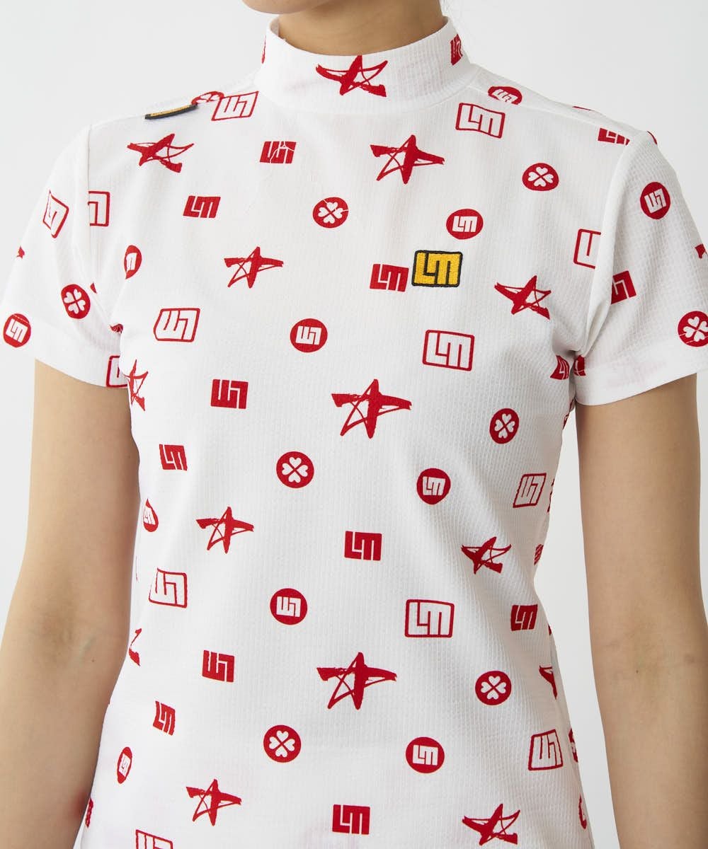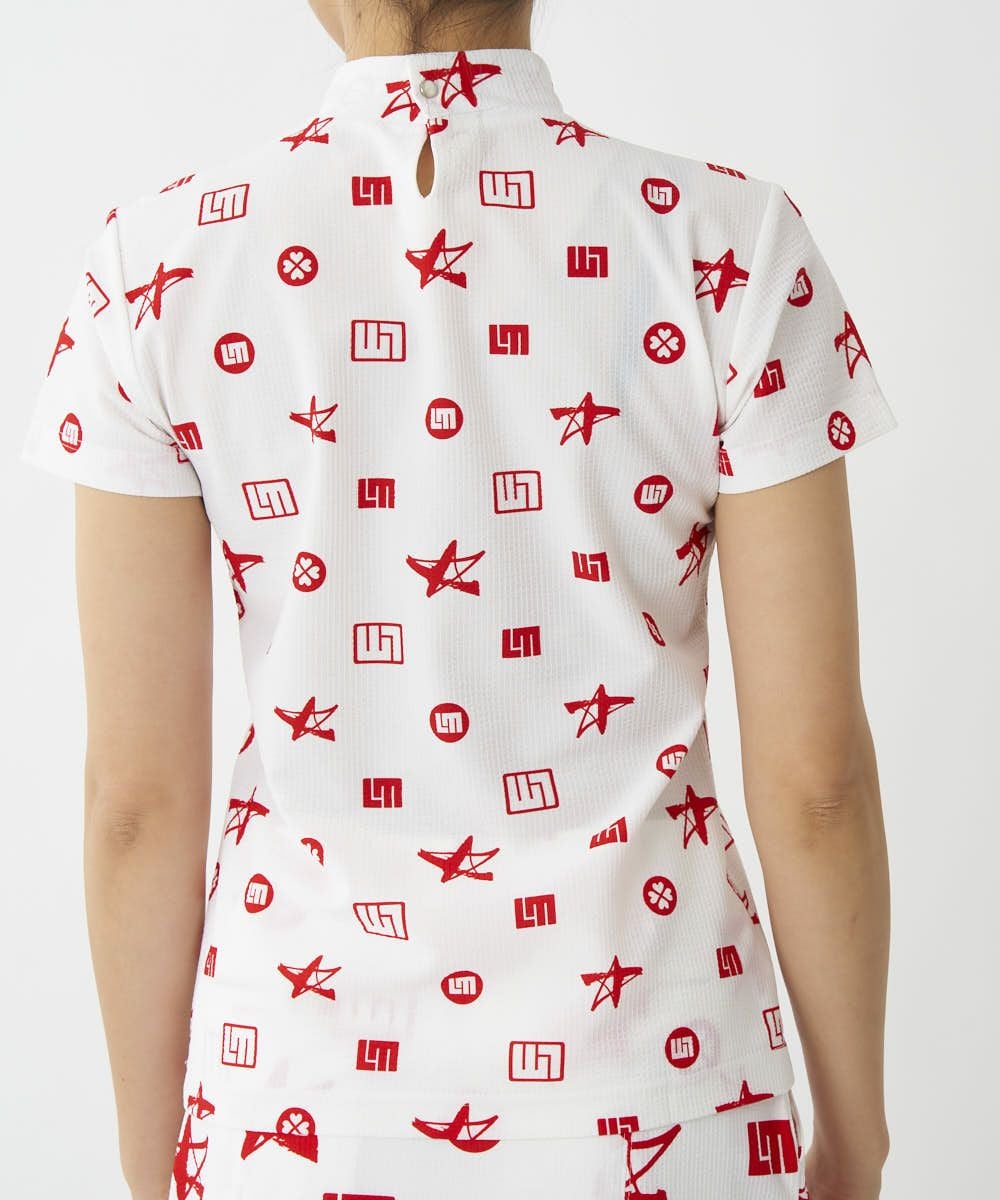 4. レディース ストレッチサッカー 柄モックネック半袖シャツ レッド