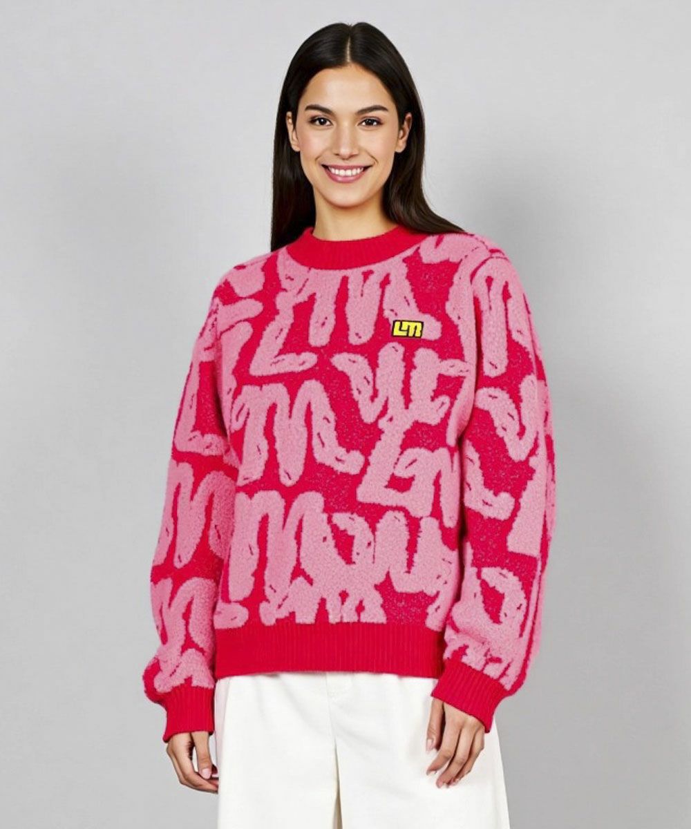 ツイード調糸ブークレーでロゴを表現した凹凸感のあるデザインニット。