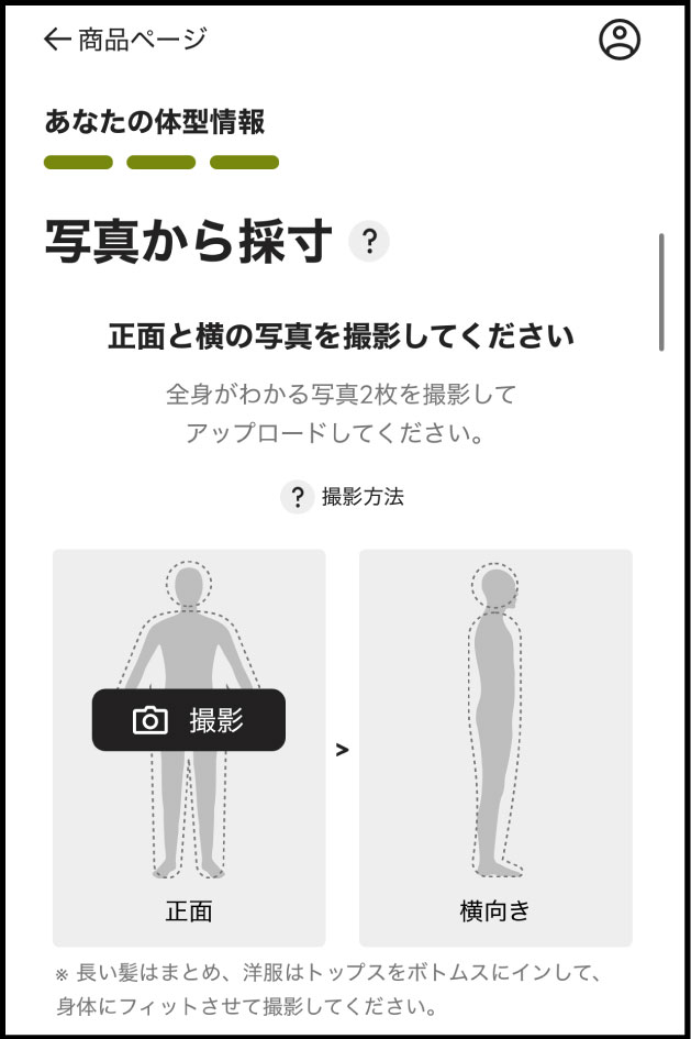 正面の写真と横向きの写真をそれぞれ撮影して、「測定開始」をタップしてください。