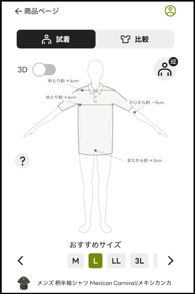 選んだアイテムのおすすめのサイズや、着用イメージがシルエットで表示されます。サイズを変更することで丈感やフィット感の違いも確認することができます。